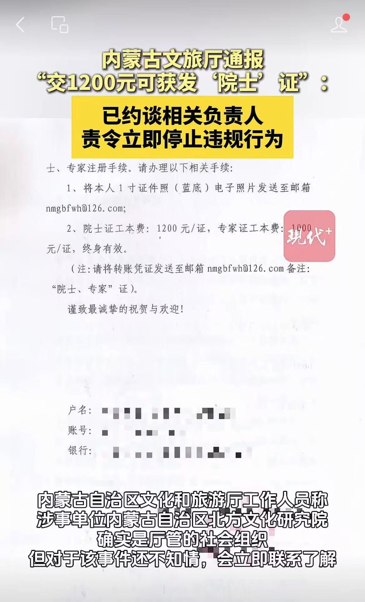 据现代快报报道,近日,一位网友发帖称,收到内蒙古一文化研究院的“院士、专家”发证通知,如需“院士”证就要交1200元/证的工本费、“专家”证要交1000元/证的工本费。4月15日,内蒙古自治区文化和旅游厅回应称,已责令涉事单位内蒙古自治区北方文化研究院立即退回费用并收回证书,同时封存相关台账资料,以配合后续调查。